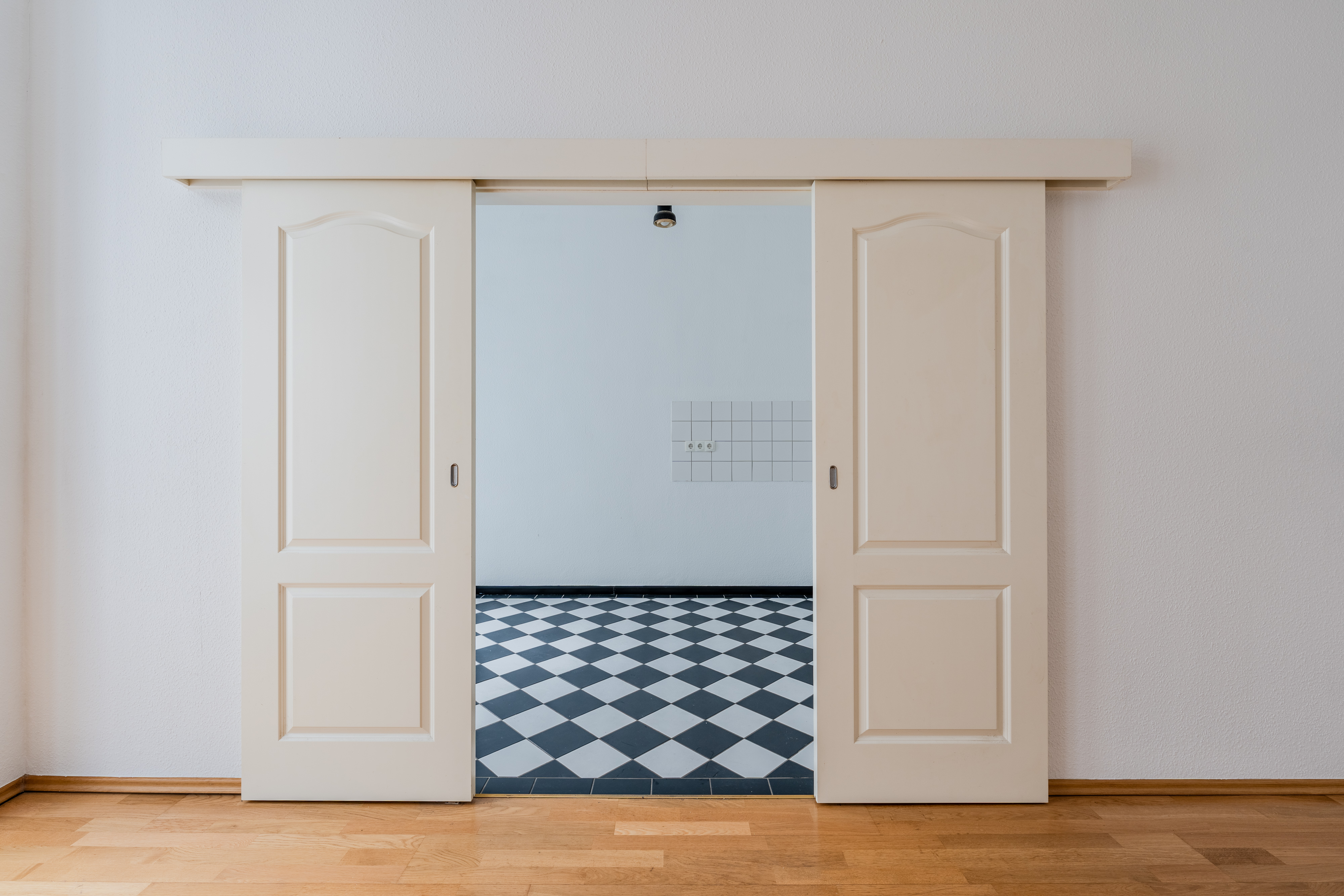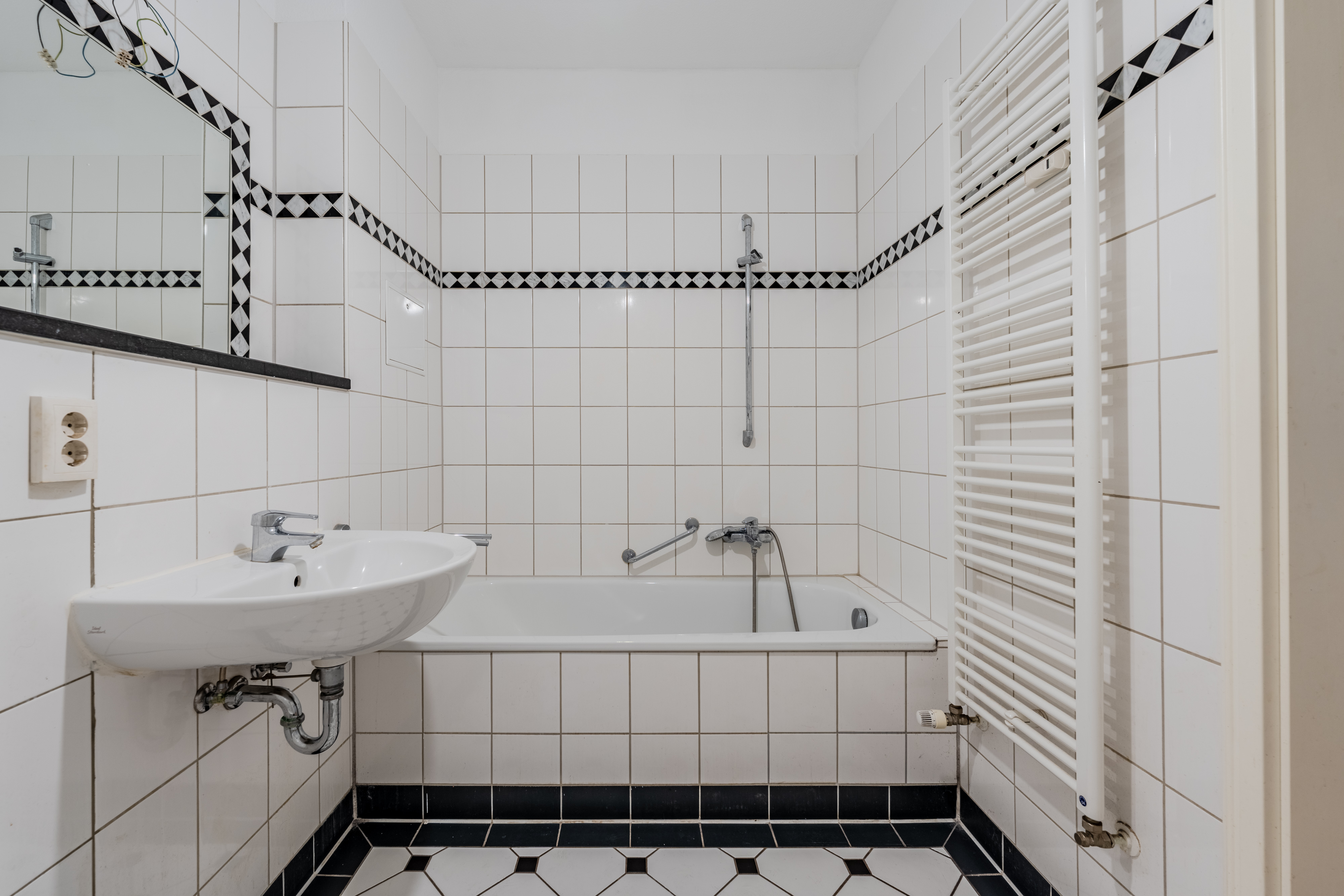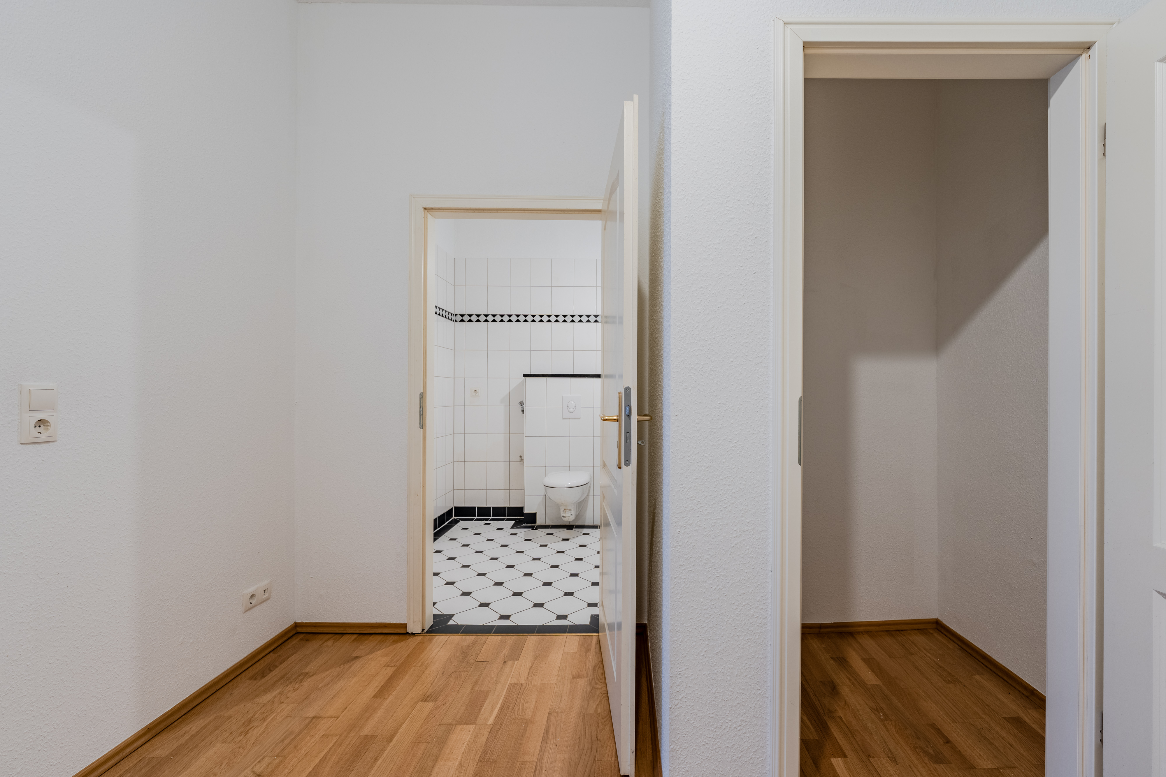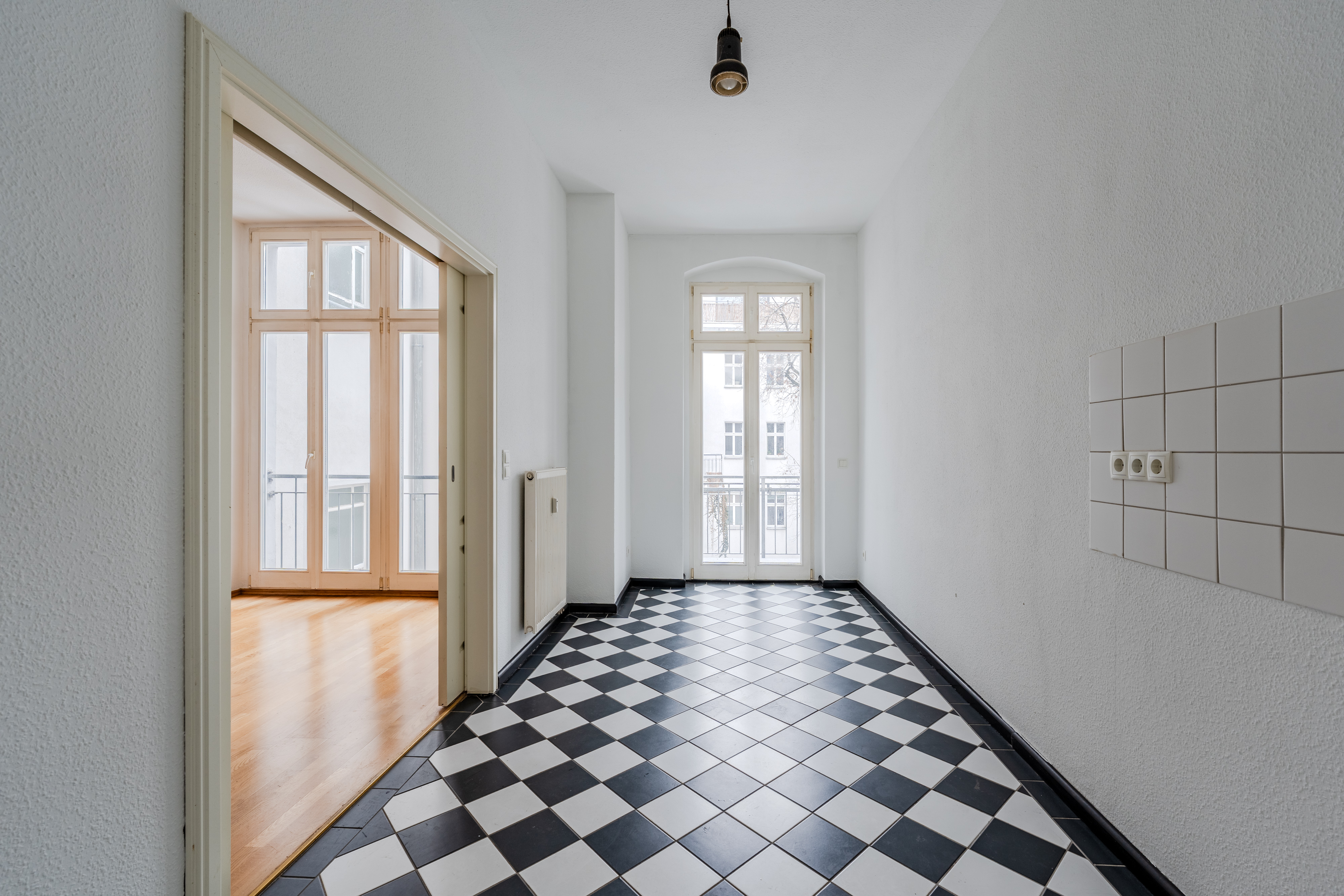 Der durchdachte Grundriss umfasst einen Flur mit praktischer Abstellkammer, ein großzügiges Badezimmer mit Badewanne sowie ausreichend Platz für eine Waschmaschine. Das große, lichtdurchflutete Wohn- und Schlafzimmer bildet das Herzstück der Wohnung und ist über eine Schiebetür mit der separaten Küche verbunden. Die Küche bietet ausreichend Raum für eine großzügige Einbauküche und verfügt über einen direkten Zugang zum Balkon.