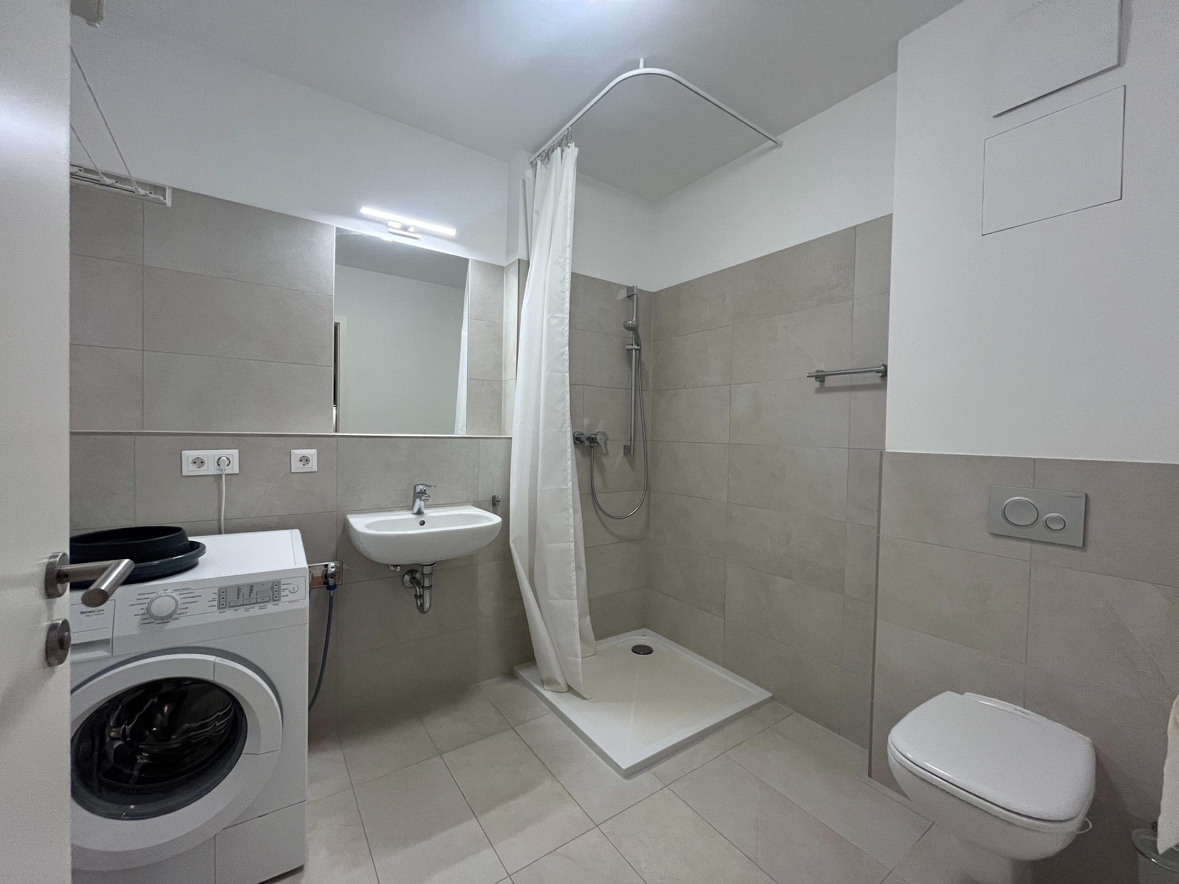 Das modern geflieste Bad ist mit einer bodengleichen Dusche, einem WC, einem Waschbecken sowie einer Waschmaschine ausgestattet.