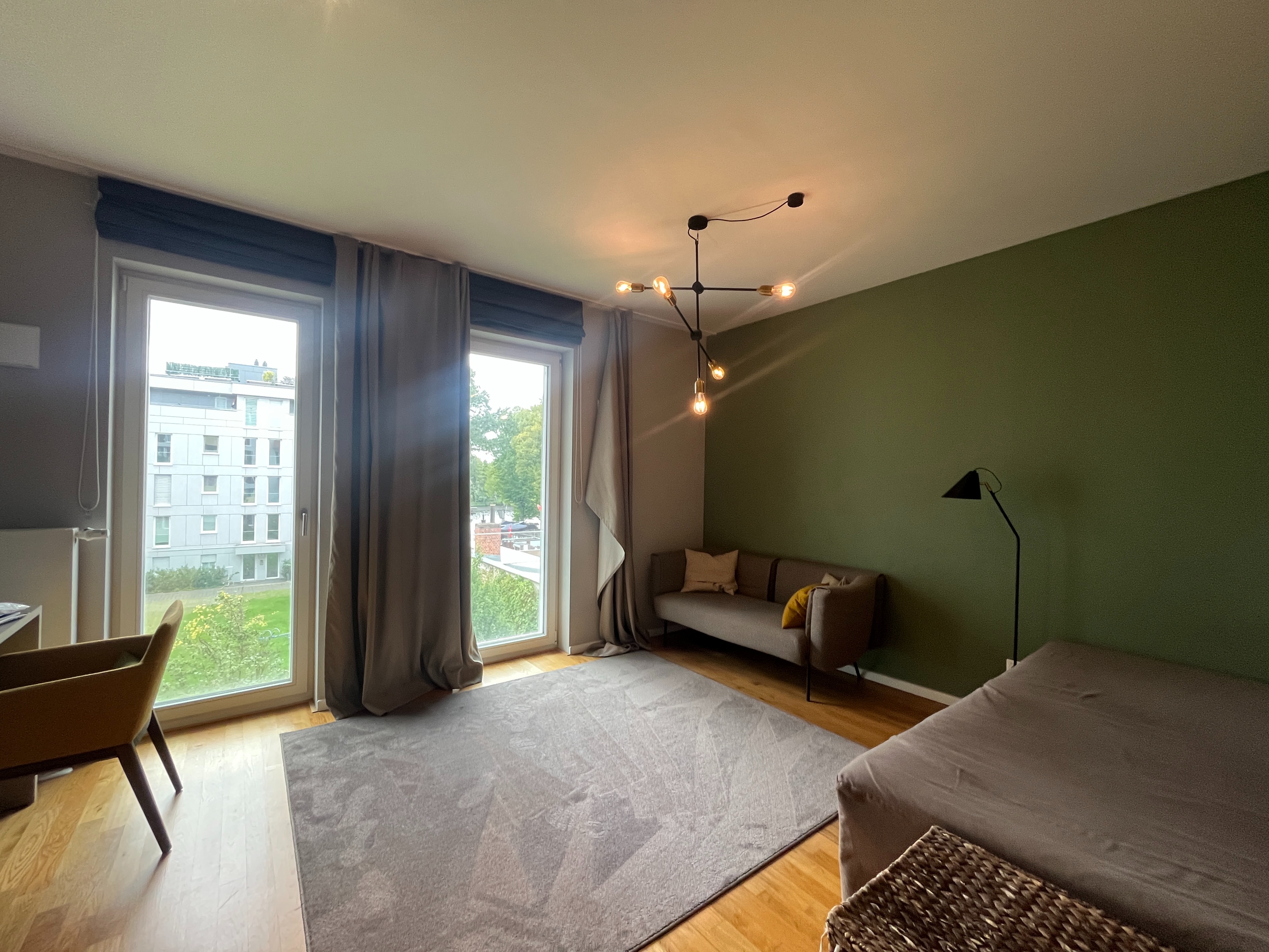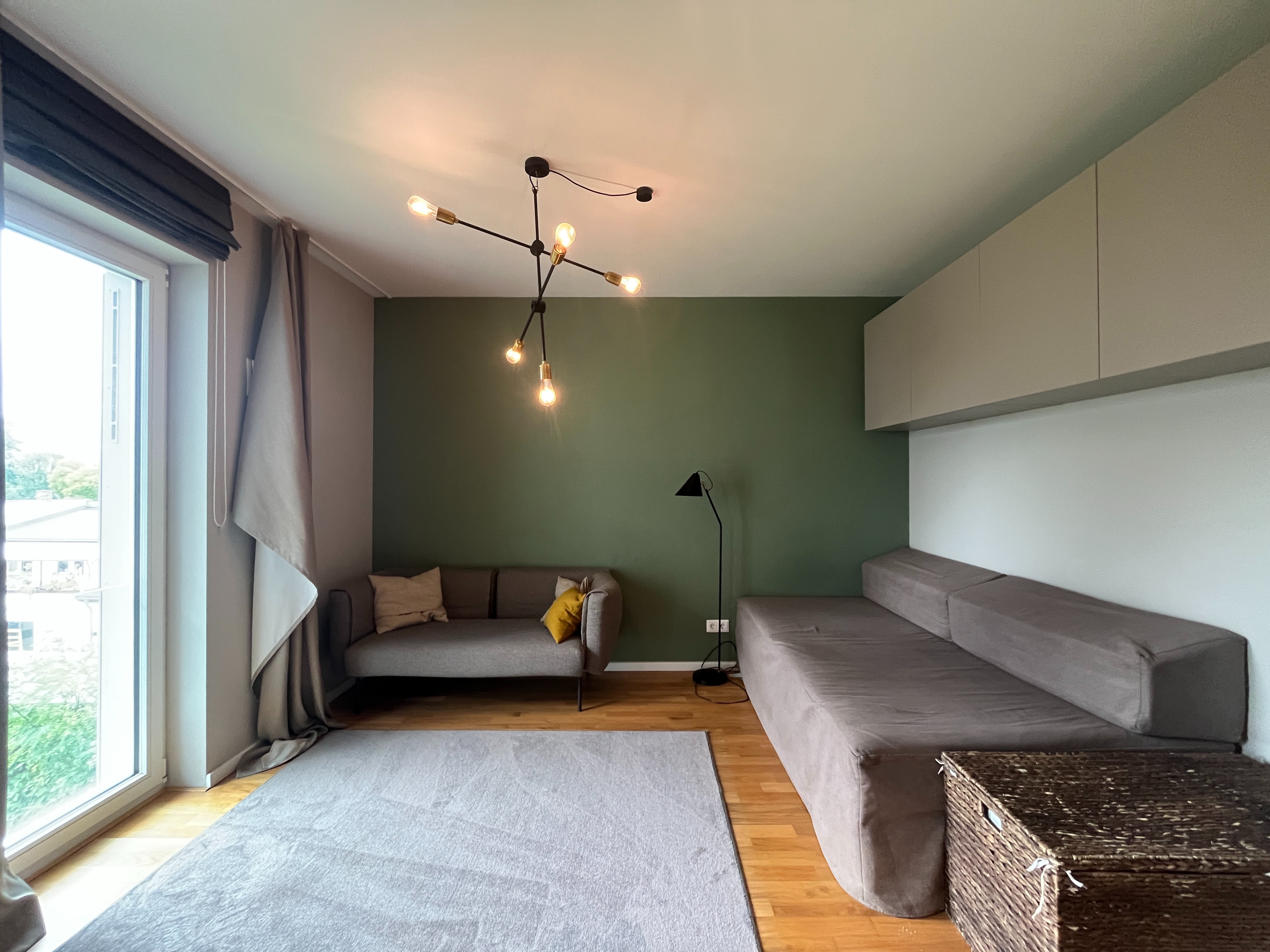Die Wände sowie die Einrichtung sind in neutralen Tönen gehalten, teils mit einer modernen Akzentfarbe in Grün, die dem Raum Charakter verleiht.