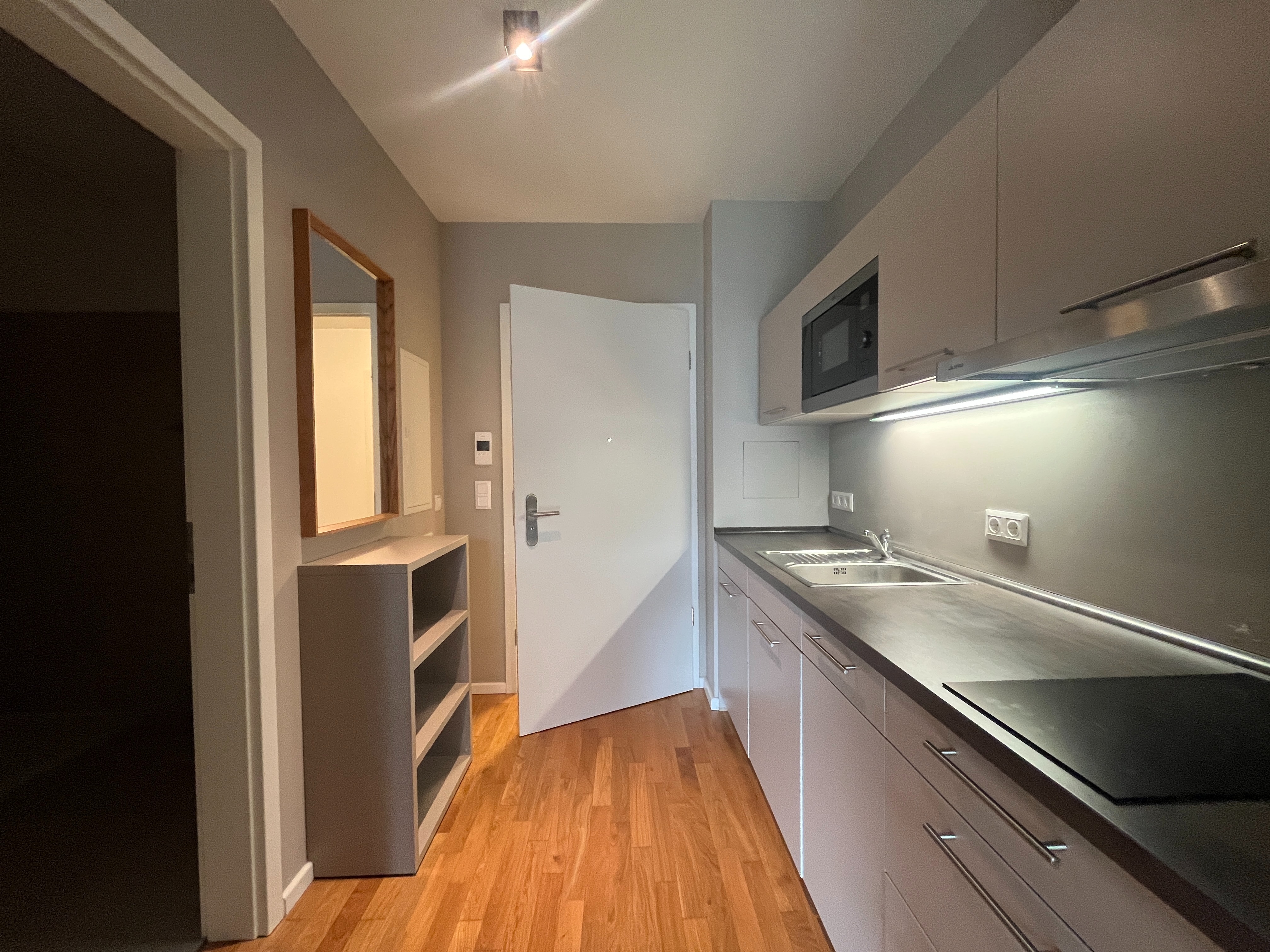 Ein weiteres Highlight ist die voll ausgestattete Einbauküche, die mit Ober- und Unterschränken, einem Kochfeld, einer Mikrowelle sowie einer Spüle eingerichtet ist. Hierdurch bietet die Wohnung alles, was für den täglichen Bedarf notwendig ist – auf kompaktem Raum und funktional durchdacht.