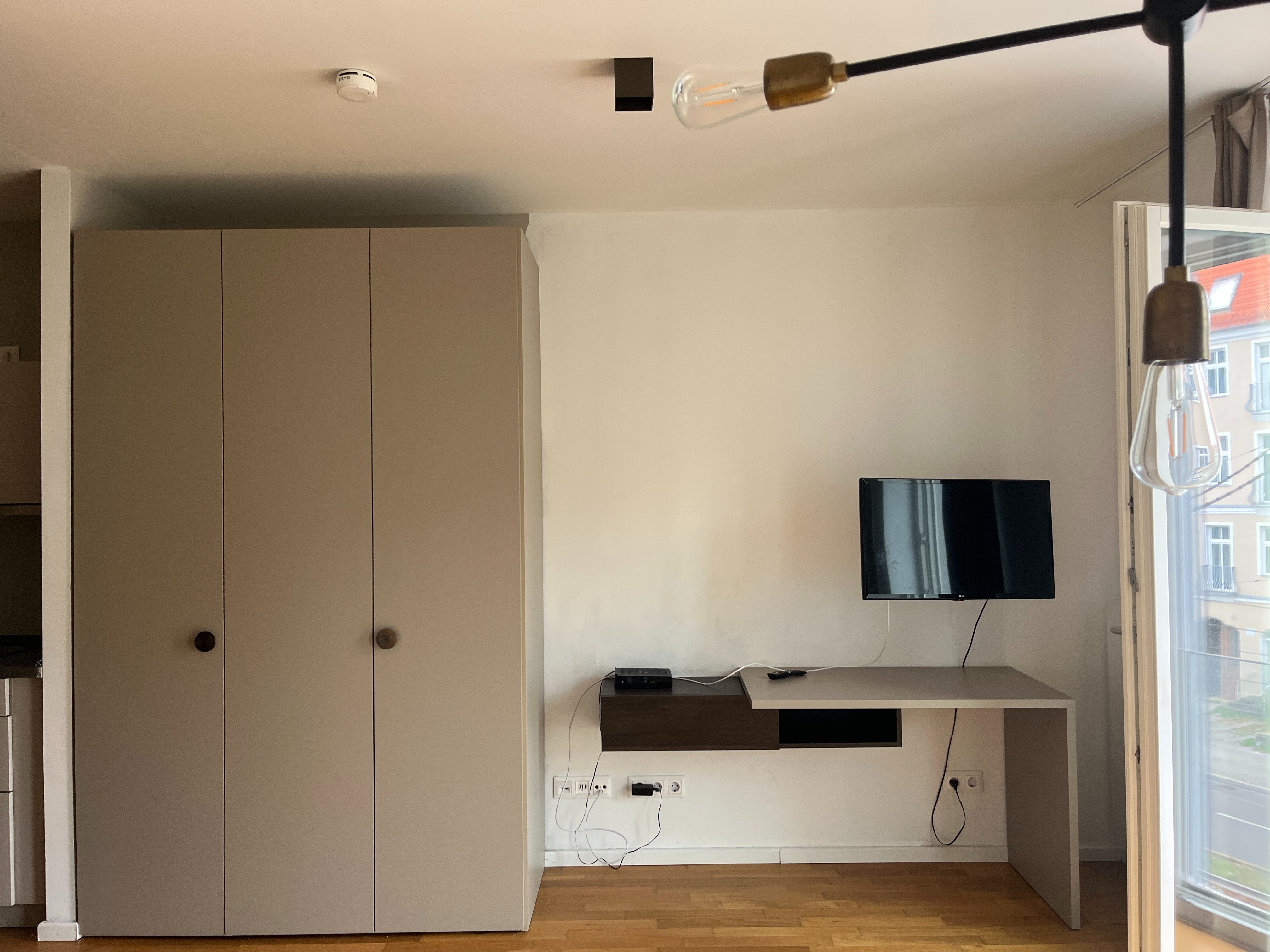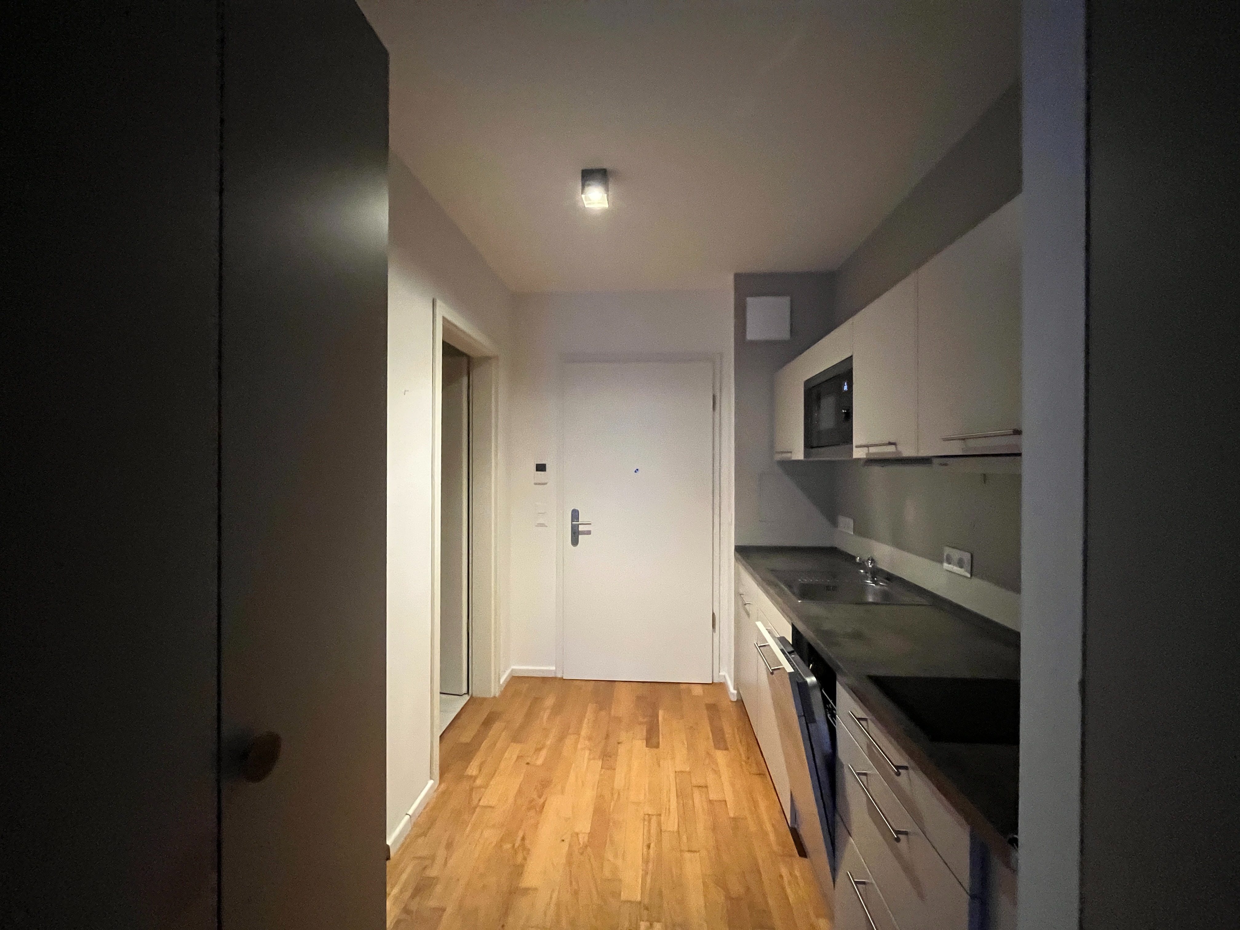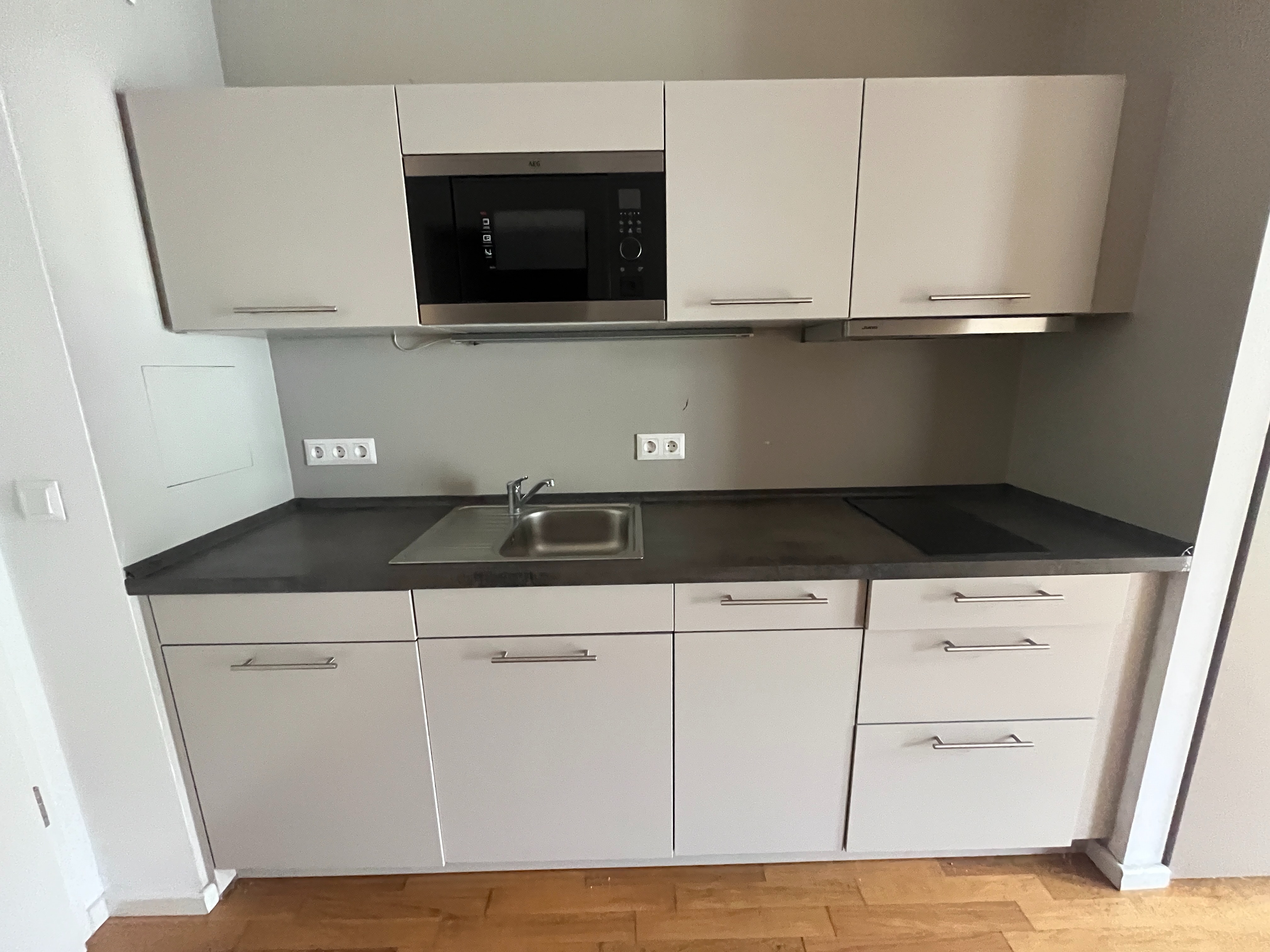 Ein weiteres Highlight ist die voll ausgestattete Einbauküche, die mit Ober- und Unterschränken, einem Kochfeld, einer Mikrowelle sowie einer Spüle eingerichtet ist. Hierdurch bietet die Wohnung alles, was für den täglichen Bedarf notwendig ist – auf kompaktem Raum und funktional durchdacht.