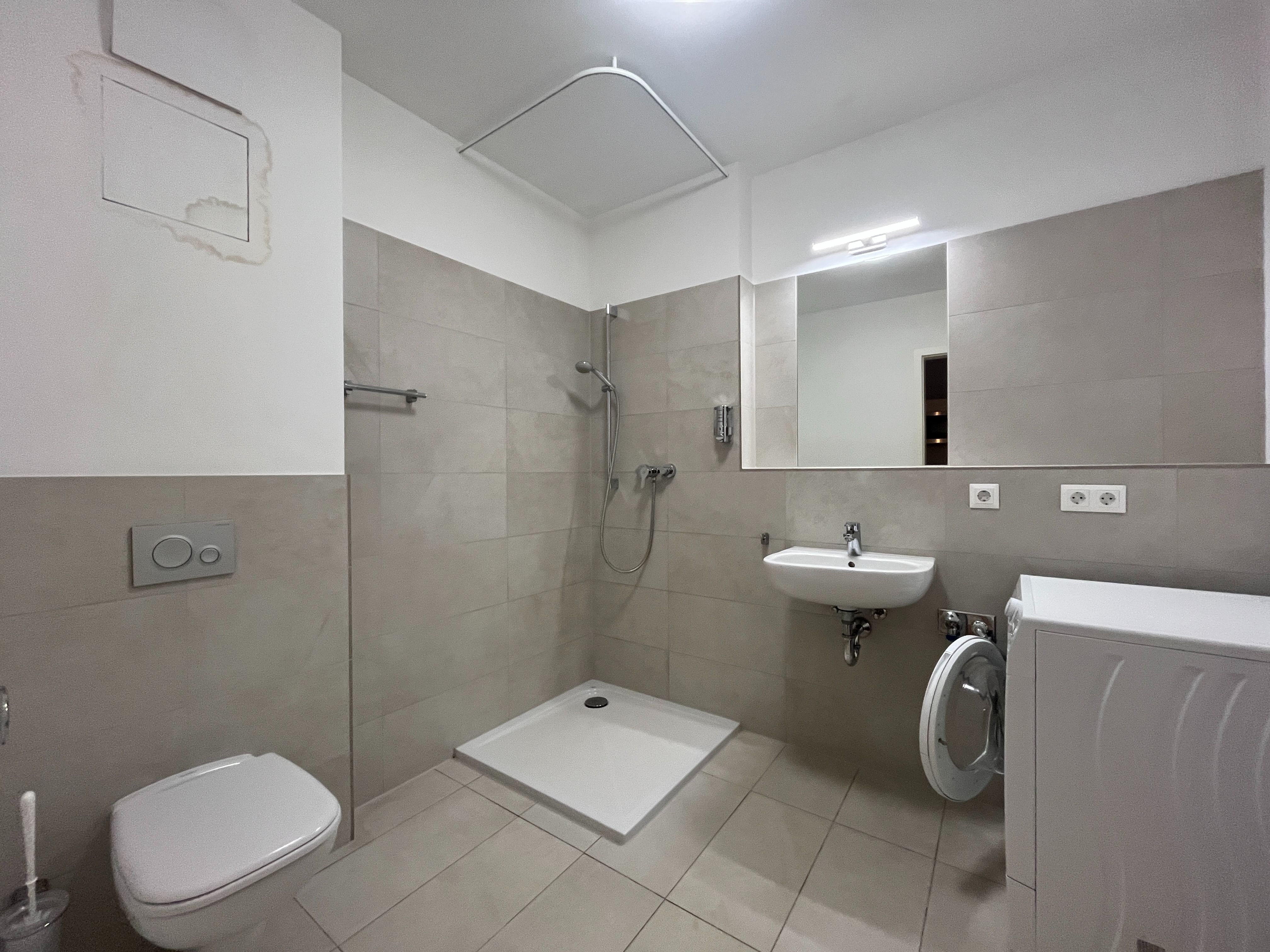 Das modern geflieste Bad ist mit einer bodengleichen Dusche, einem WC, einem Waschbecken sowie einer Waschmaschine ausgestattet.