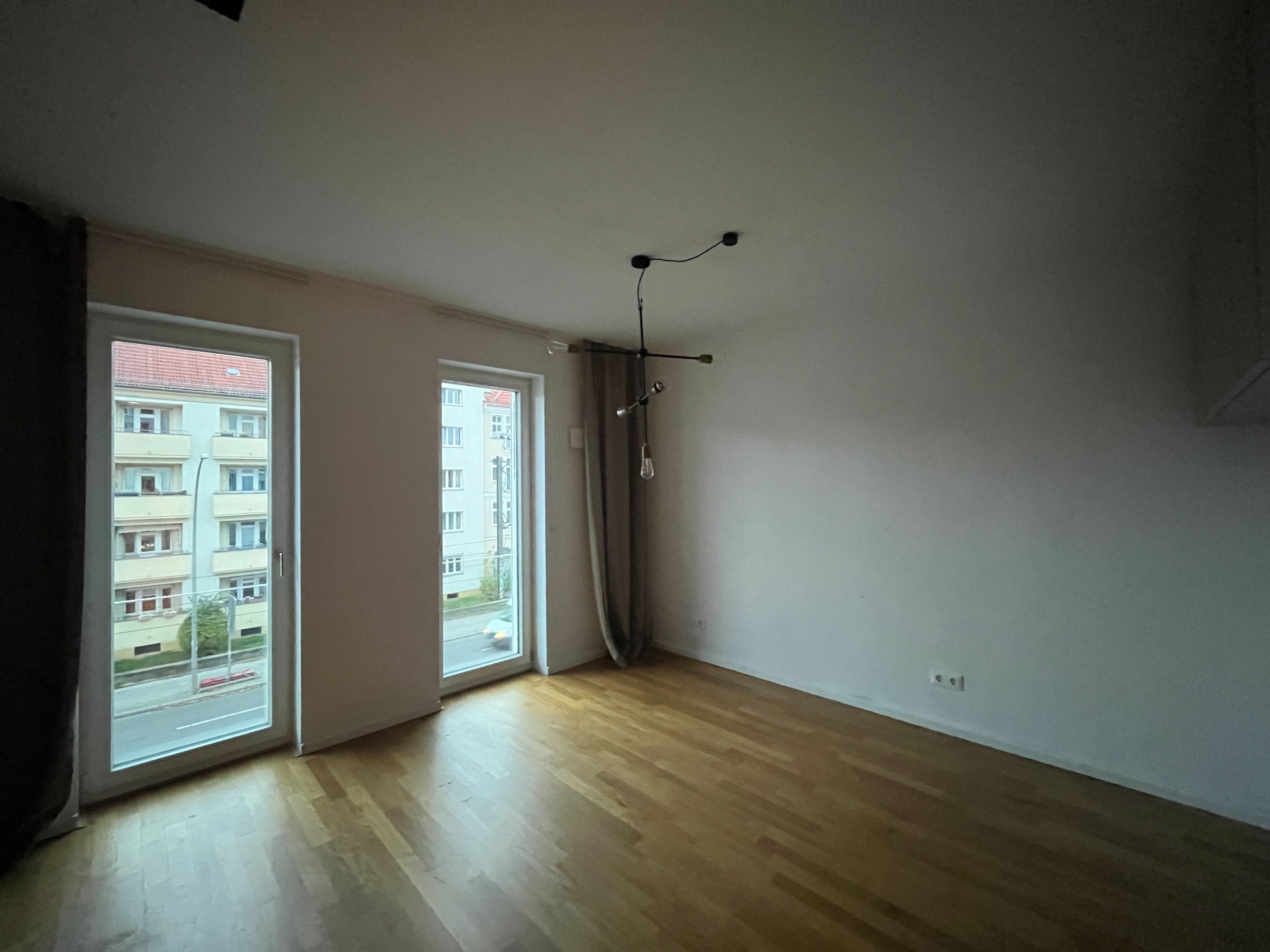 Der Wohnbereich ist mit einem behaglichen Parkettboden ausgestattet, der eine warme und freundliche Wohnatmosphäre schafft. Die großen Fenster lassen viel Tageslicht in den Raum und sorgen für eine helle Wohnqualität. Für Sicht- und Sonnenschutz sind Vorhänge bereits vorhanden.