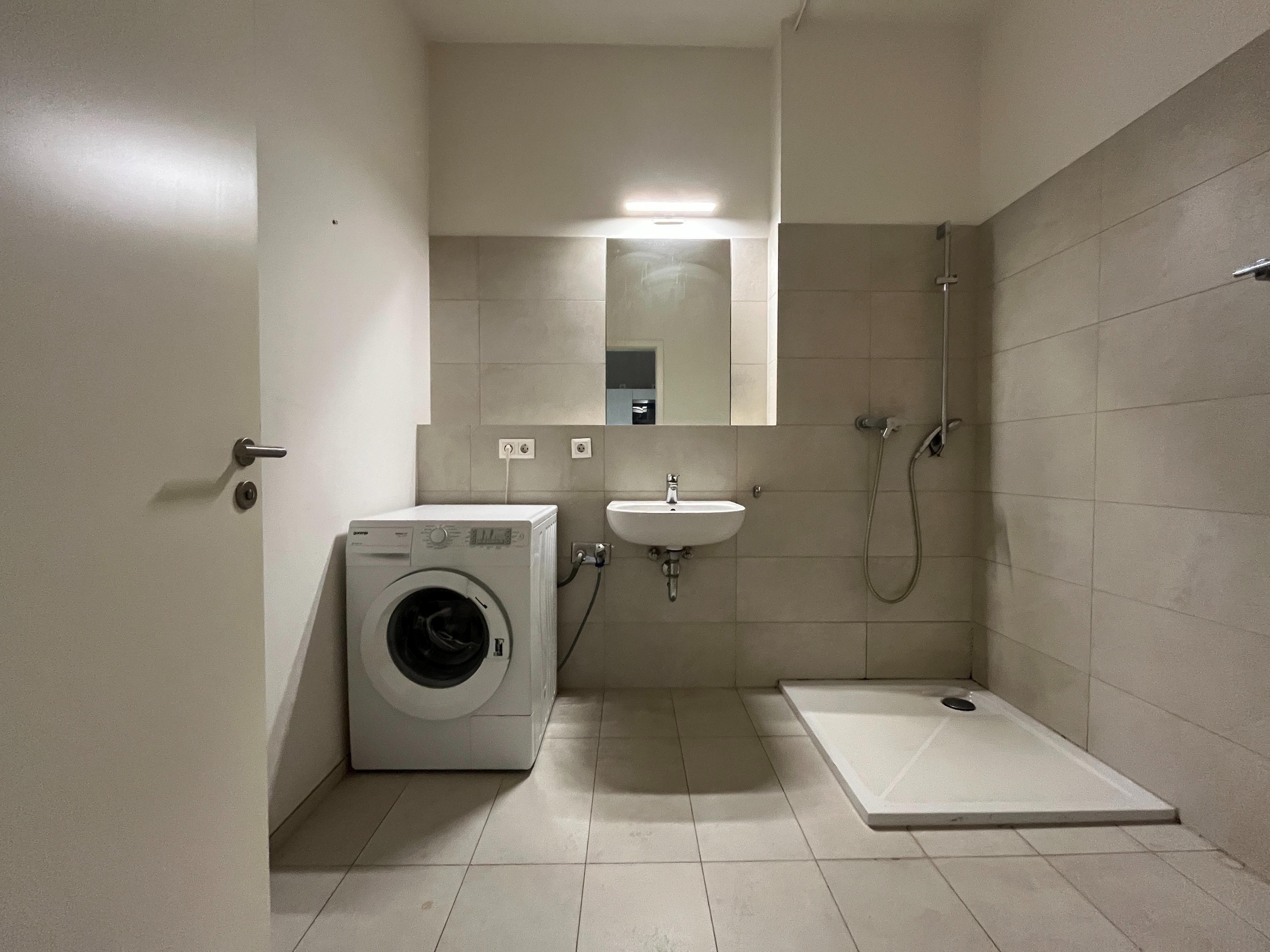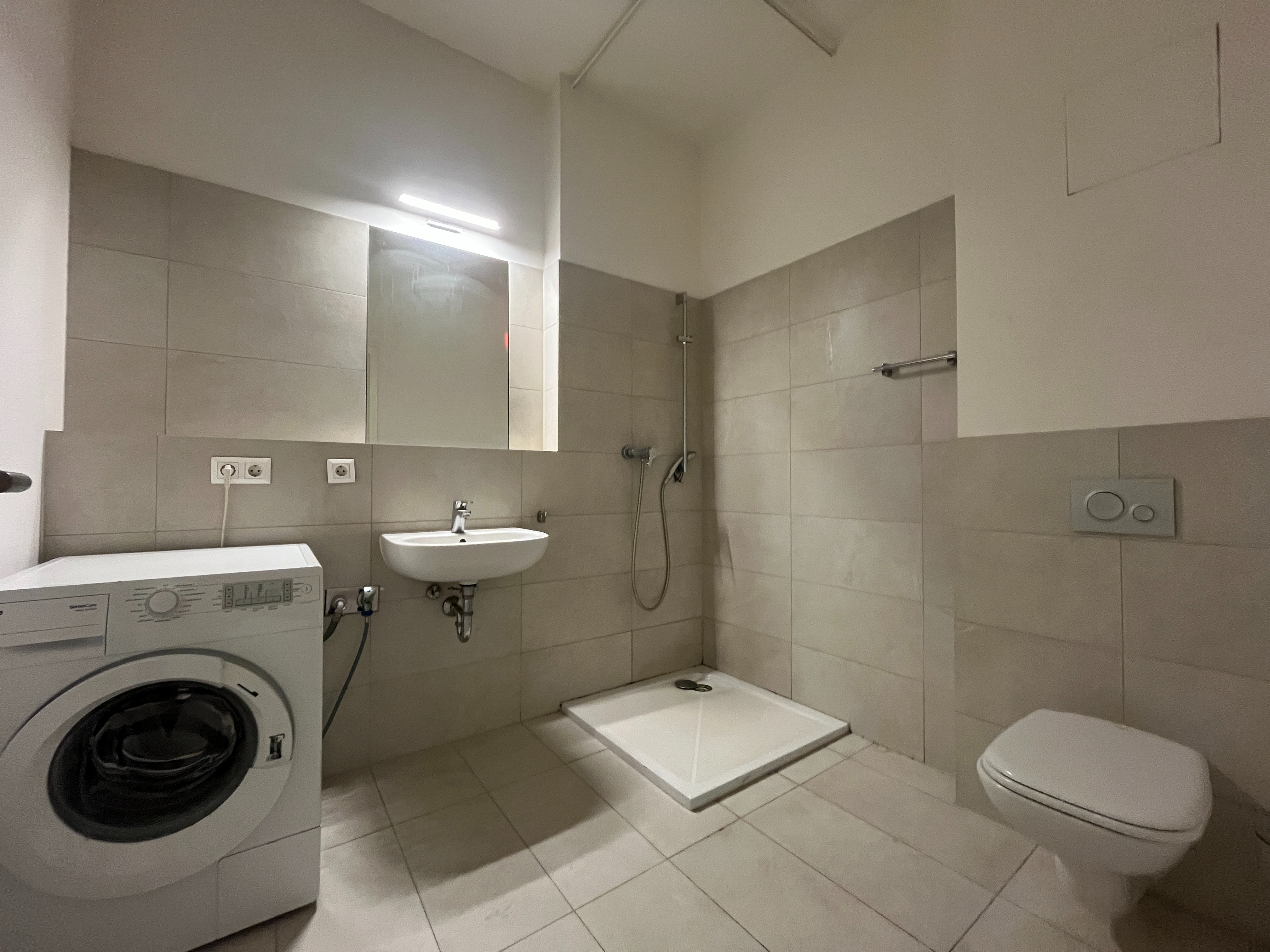 Das modern geflieste Bad ist mit einer bodengleichen Dusche, einem WC, einem Waschbecken sowie einer Waschmaschine ausgestattet.