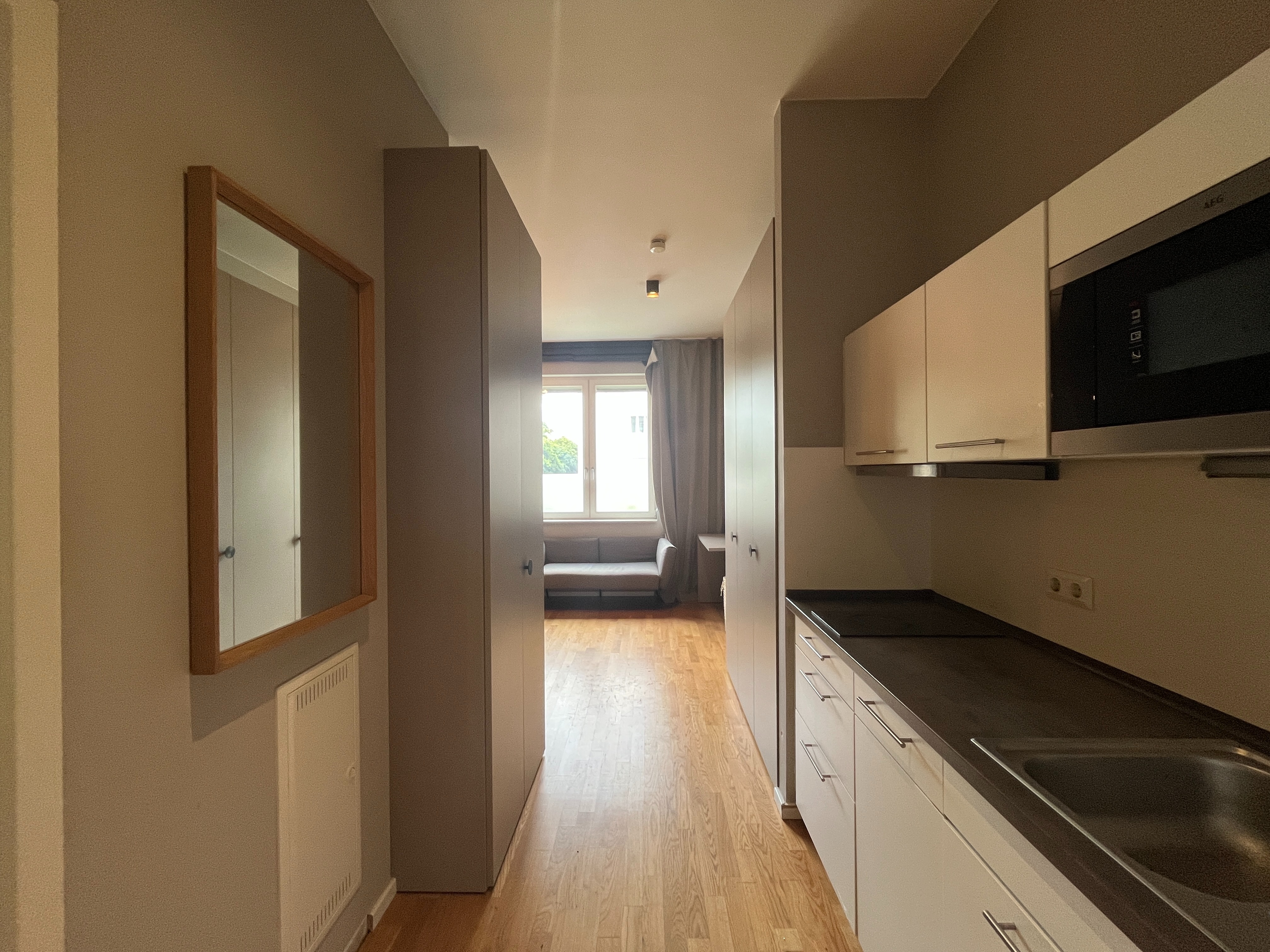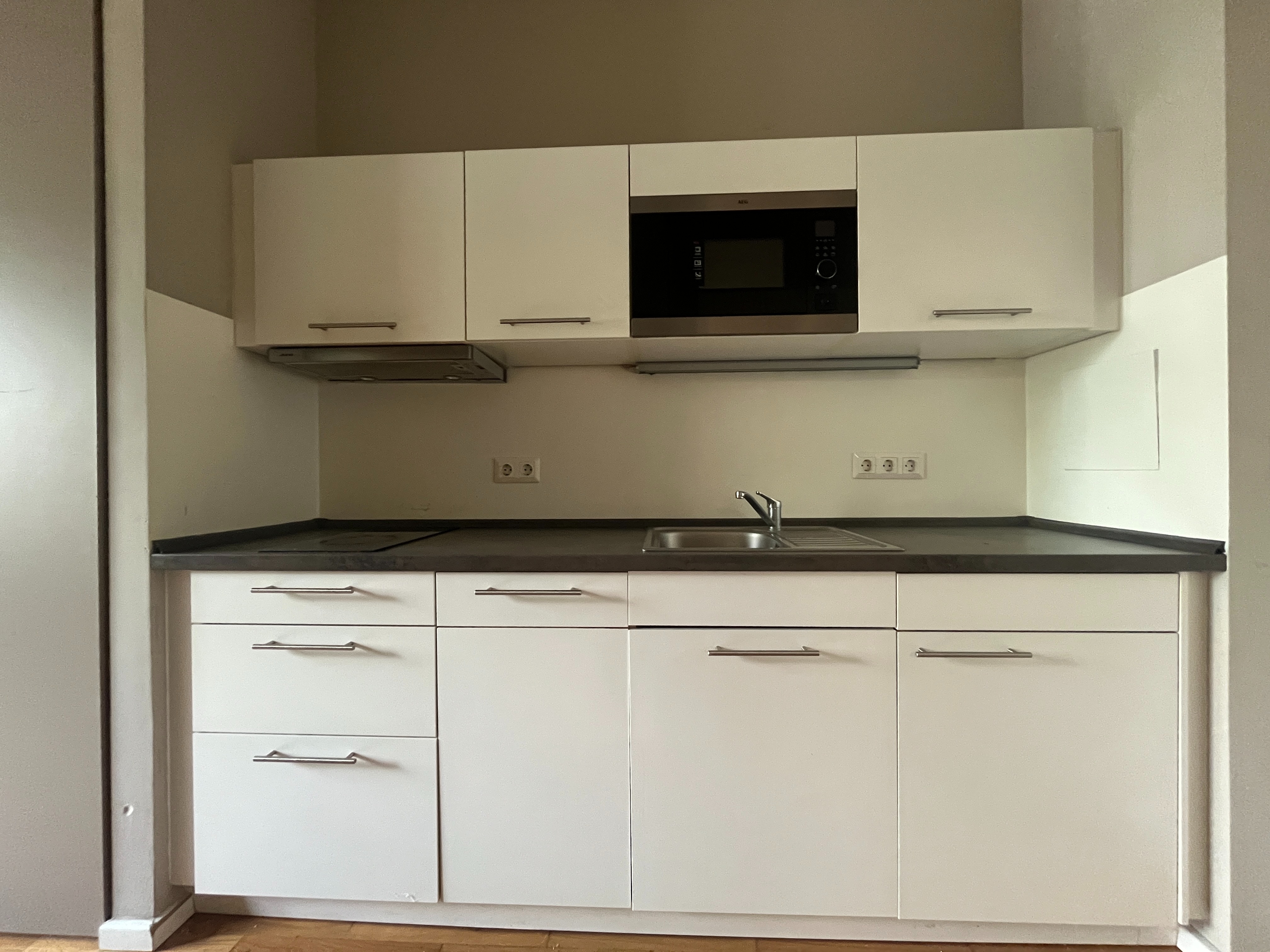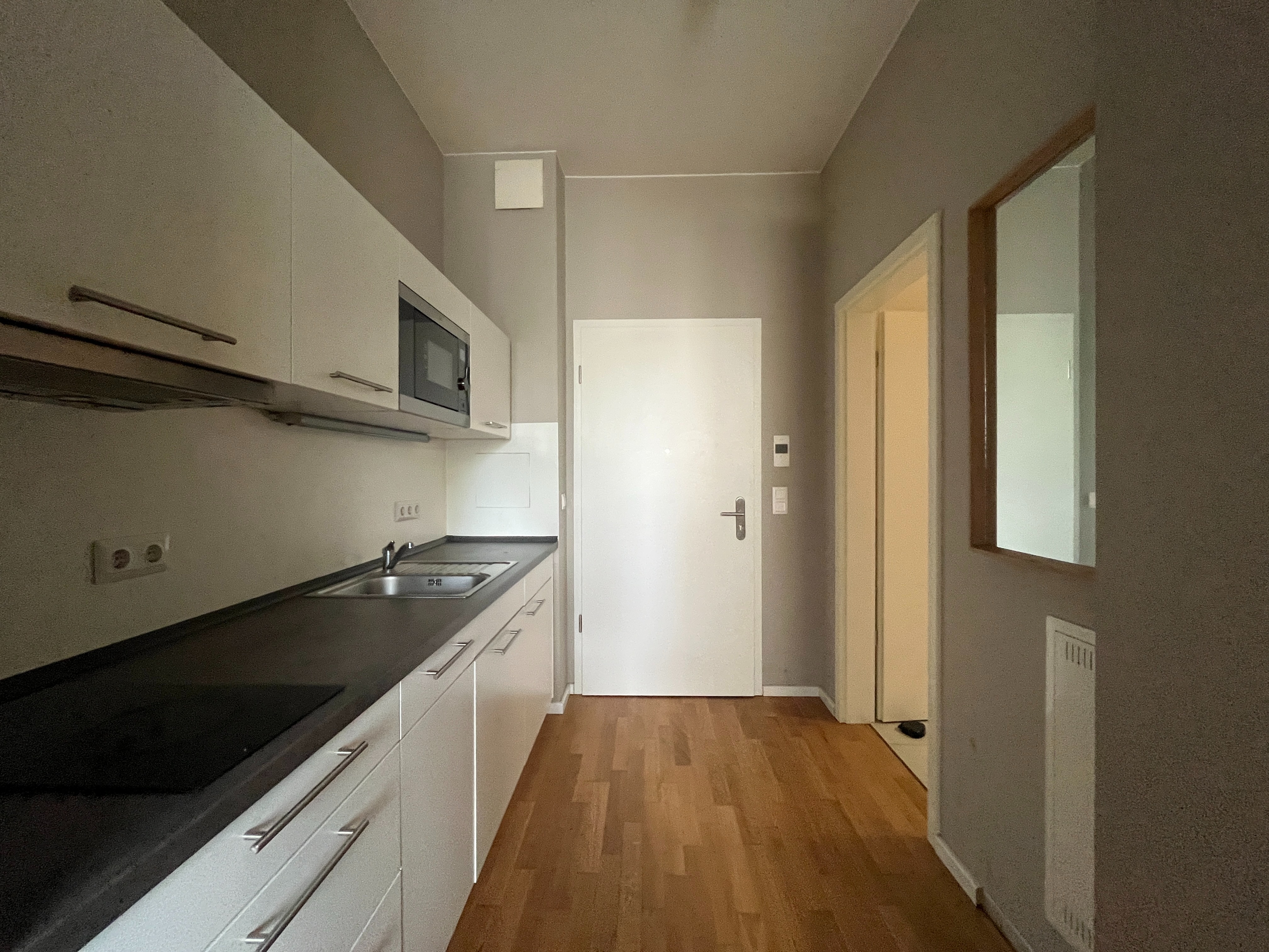 Ein weiteres Highlight ist die voll ausgestattete Einbauküche, die mit Ober- und Unterschränken, einem Kochfeld, einer Mikrowelle sowie einer Spüle eingerichtet ist. Hierdurch bietet die Wohnung alles, was für den täglichen Bedarf notwendig ist – auf kompaktem Raum und funktional durchdacht.