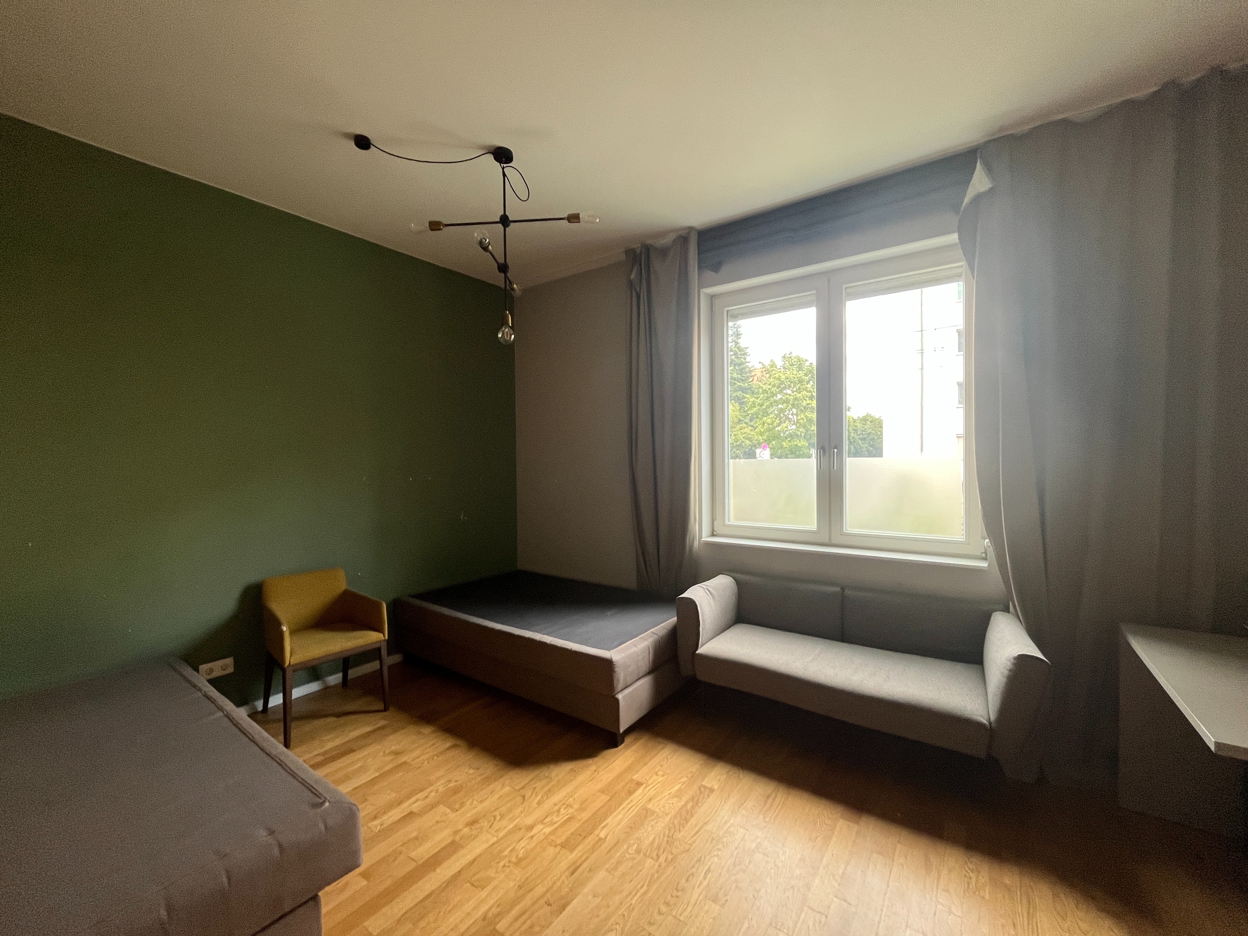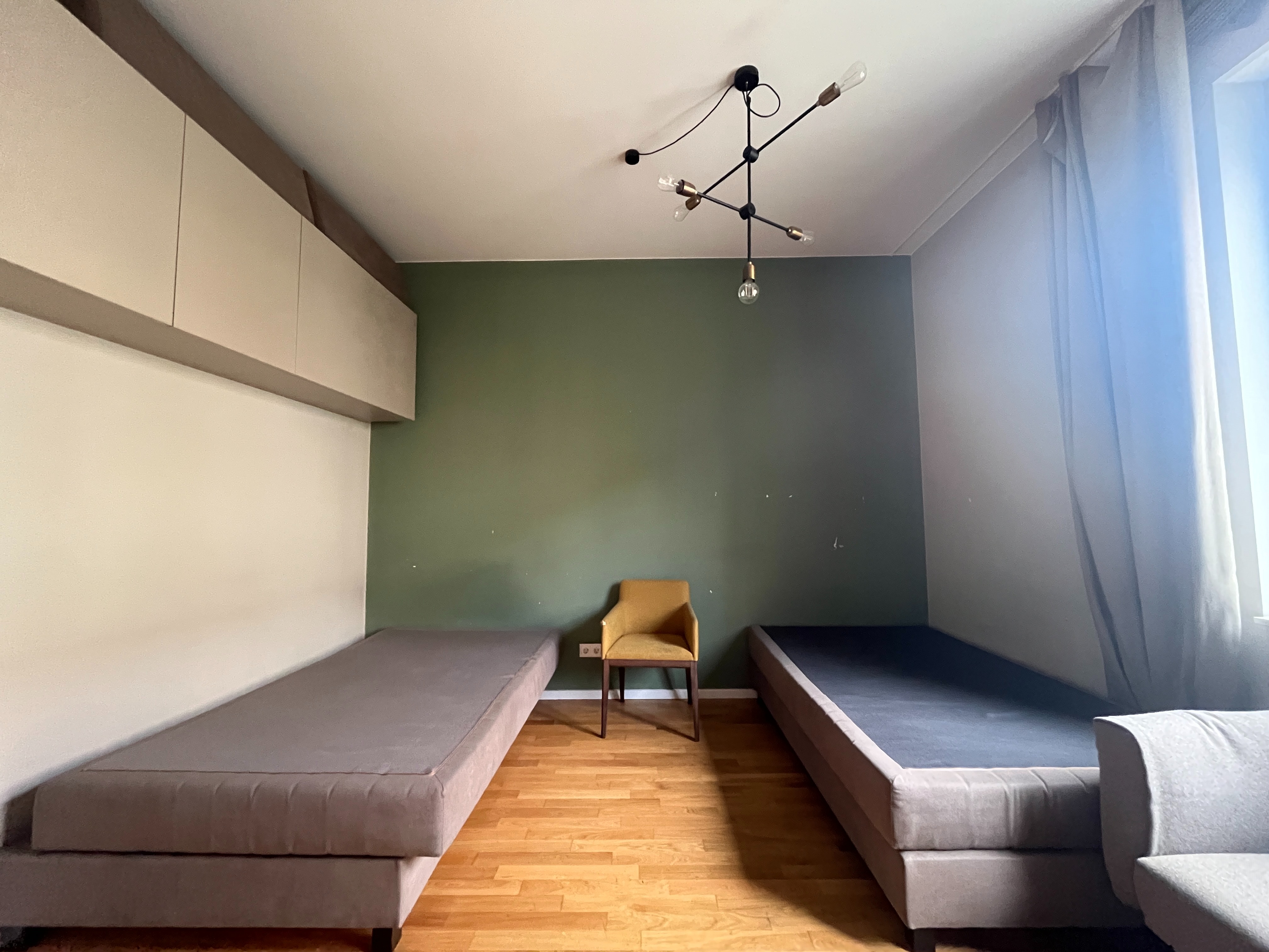 Die Wände sowie die Einrichtung sind in neutralen Tönen gehalten, teils mit einer modernen Akzentfarbe in Grün, die dem Raum Charakter verleiht.