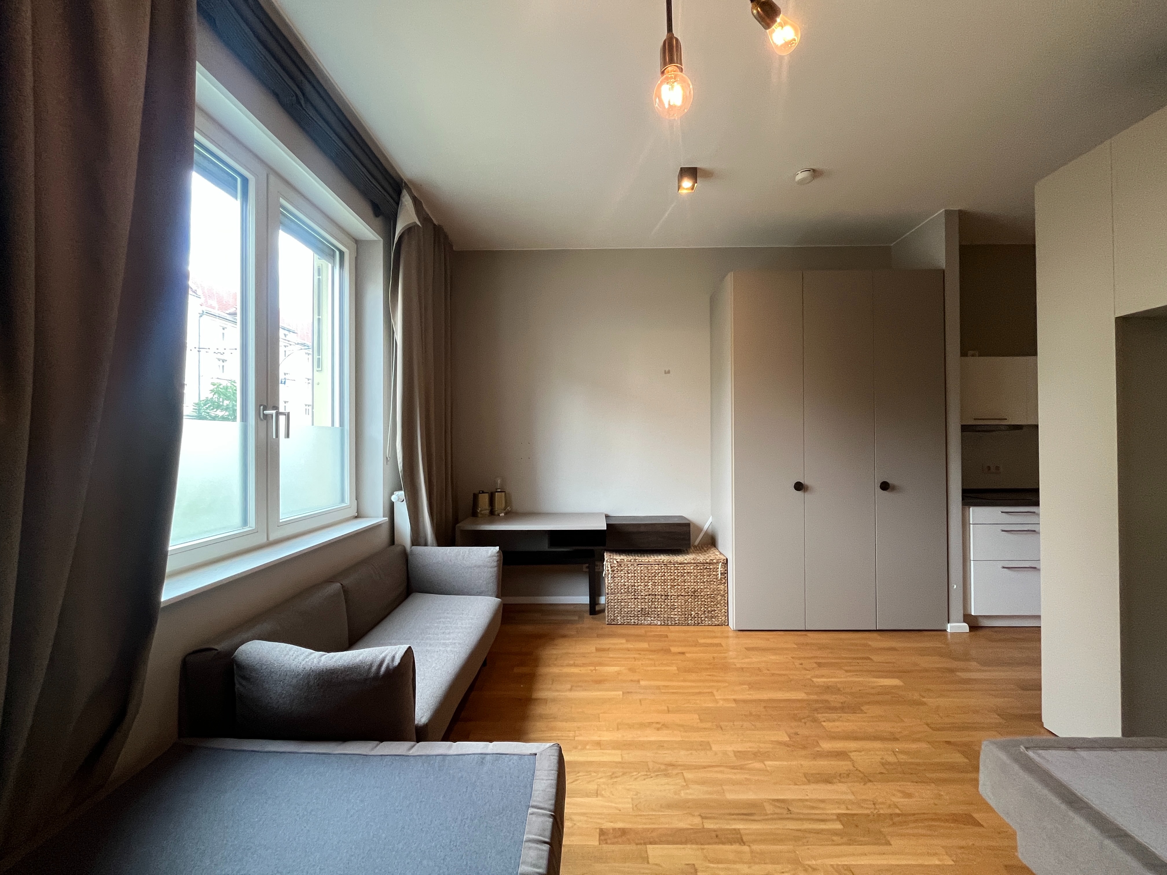 Das moderne 1-Zimmer-Apartment befindet sich im Erdgeschoss und verfügt über eine Wohnfläche von ca. 29,12 m². Das Fenster ist zur Lindenstraße ausgerichtet.